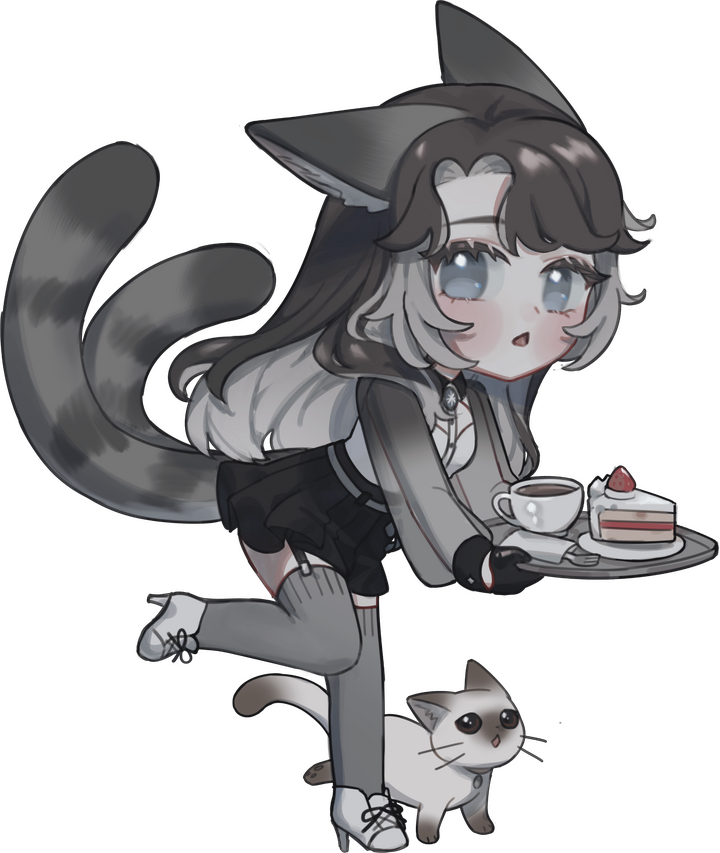 A grey tabby nekotomata.Owner of The Midnight Cafe - a coffee shop that sits in a void.